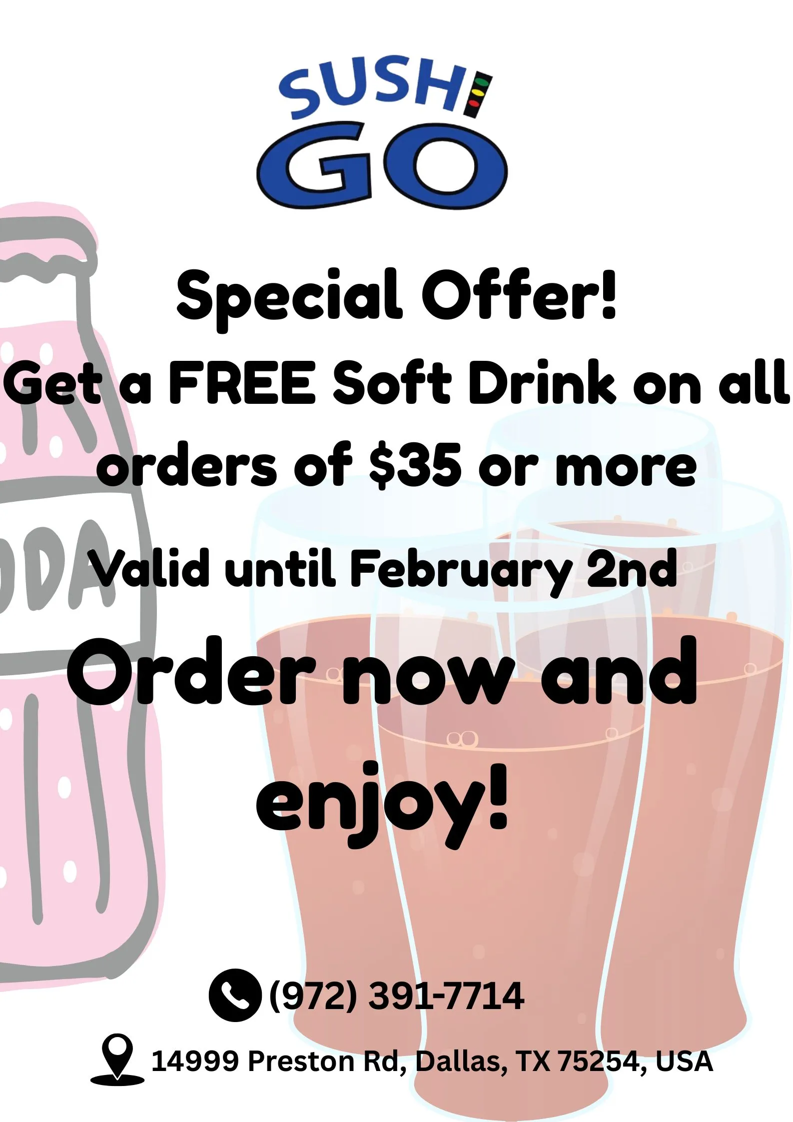 At Sushi Go, you can find a variety of cuisines such as Kani Kama Roll, Fire Dragon, Eel Roll, Elvis Roll, and Dynamite Roll. We are conveniently located along Preston Road. We're not far from Trader Joe's. Order online for carryout!